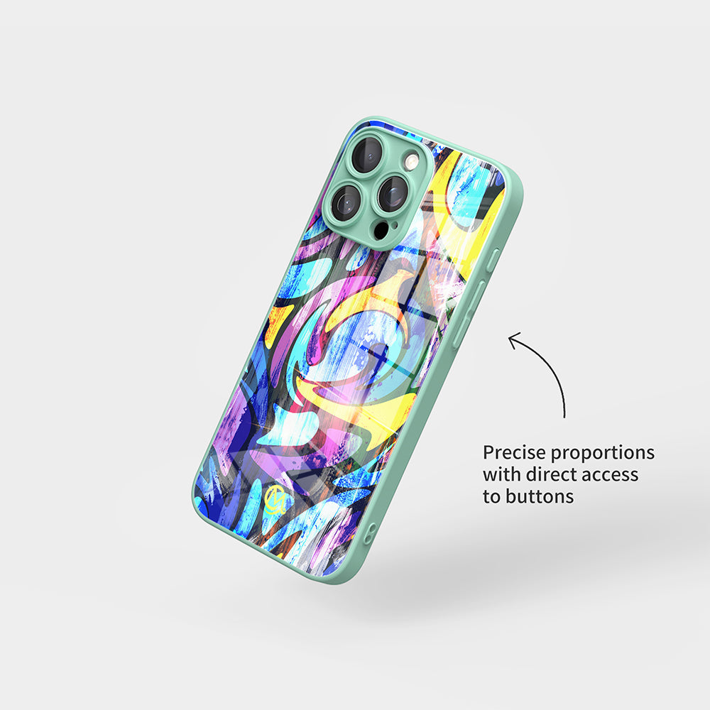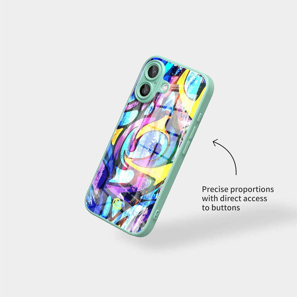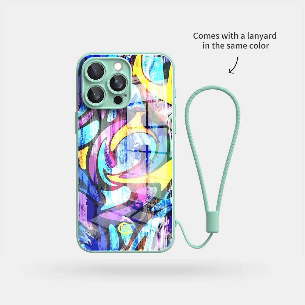 Colored Graffiti - Jumping Fun | Macaron Tempered Glass iPhone Case (Optional MagSafe Compatible or Standard).